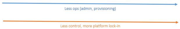 In the first column, we have more low-level access to hardware, underlying operating system, and machine, with virtual machines we have abstraction over hardware. At the right end, you have hosted apps and serverless functions, that give you fewer ops and less administrative overhead and you don’t have to provision your own machine. We focus on the code and the platform takes care of the rest. However, this means you have less control and more platform lock-in.