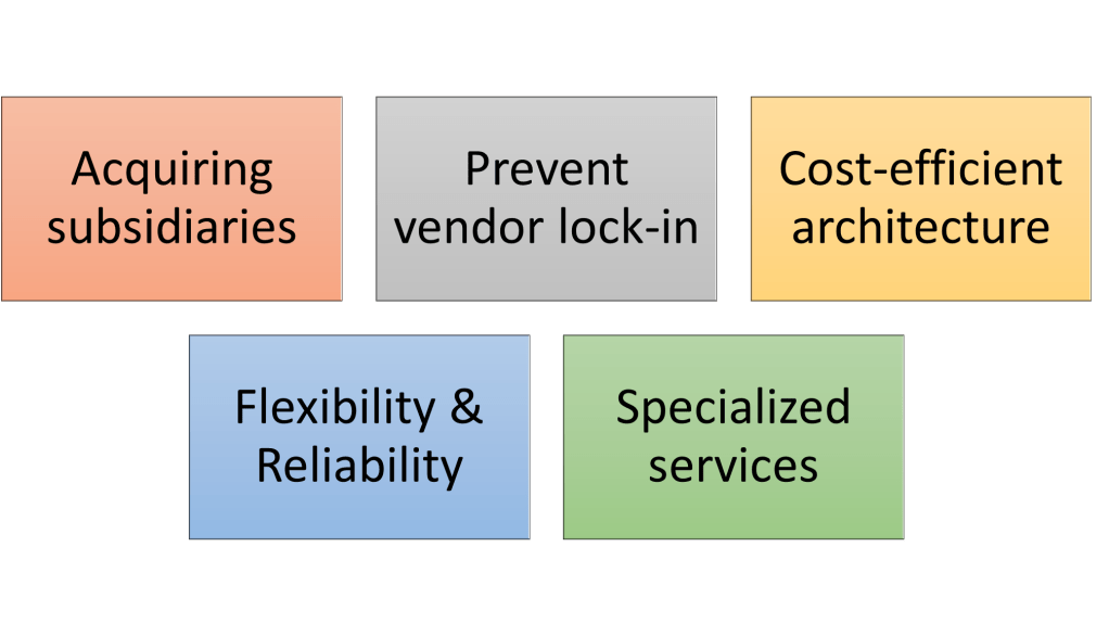 The fourth reason is when globally distributed enterprises / international companies acquire offices/subsidiaries in different countries, or they have to be merged with other companies, and they may have their resources in different clouds. Since a particular cloud provider doesn’t have a data center in a country.