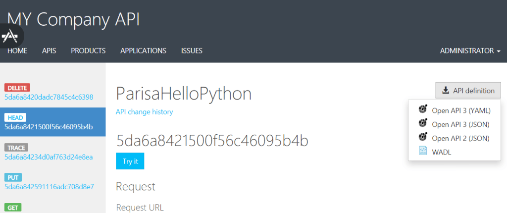 The developers can export the API definition in OpenAPI JSON format and WADL from API Management Developer Portal.